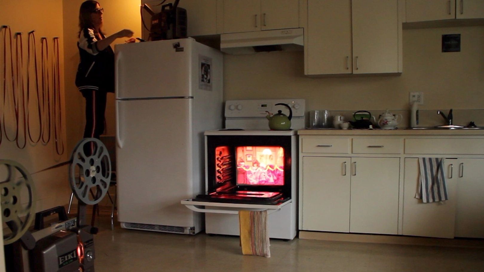 an episode called “The Shower” from the 1974 sitcom Rhoda was cut into 6 foot loops and altered in order to re-edit a tired story of the heteronormative bridal shower. the loops were selected and projected out the kitchen window or into the stove by the artist while tea and cake was served.